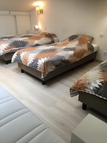 3 slaapkamers ( 1 met 1 tweepersoonsbed, 2de slaapkamer met 2 éénpersoonbedden en een grote slaapkamer met 3 één persoon bedden ) , ruime badkamer, toilet. WIFI over de ganse woning & tuin.
